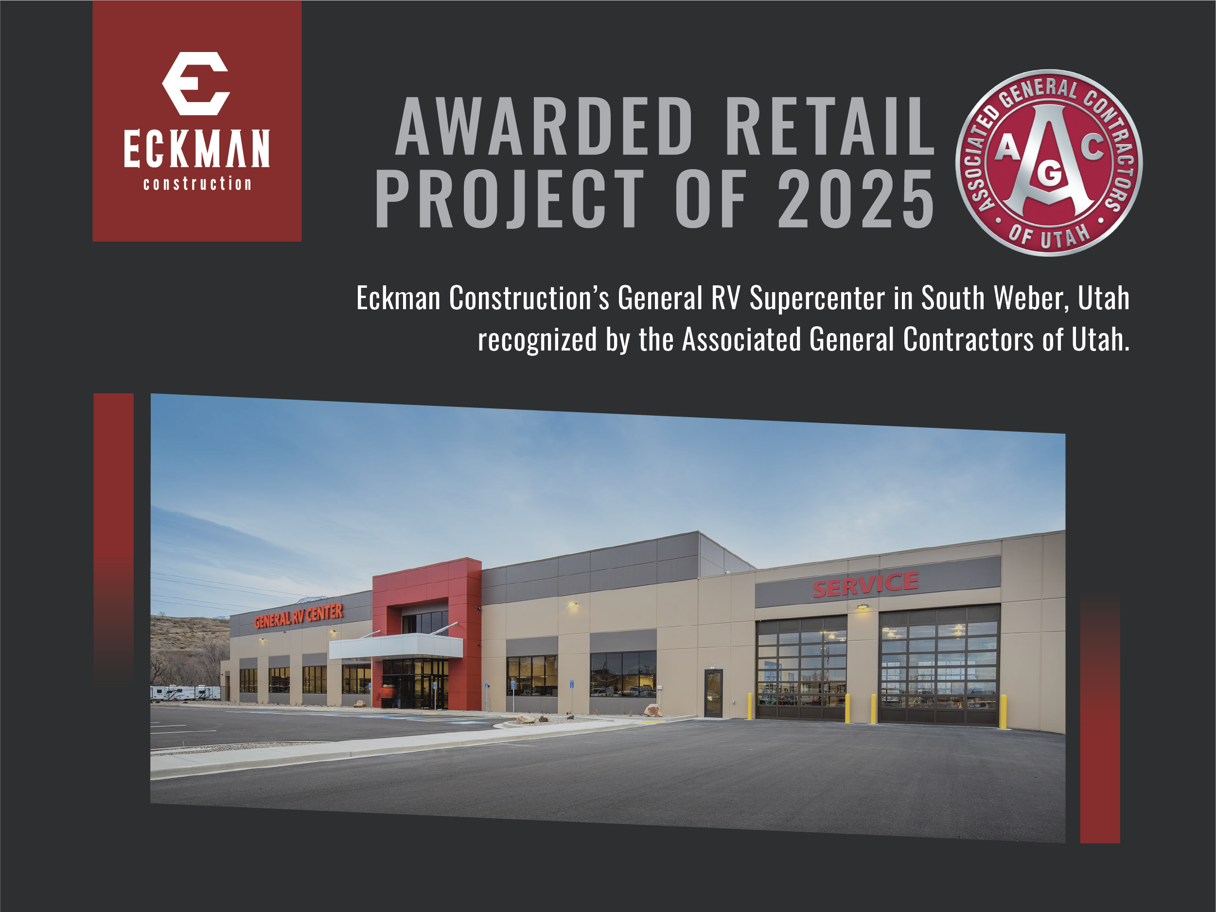 General RV Awarded 2025 “Retail Project of the Year” by The AGC of Utah November 14, 2025 Eckman Construction is honored to receive The Associated General Contractors (AGC) of Utah’s 2025 “Retail Project of the Year” Award for the General RV Supercenter.… Read More
